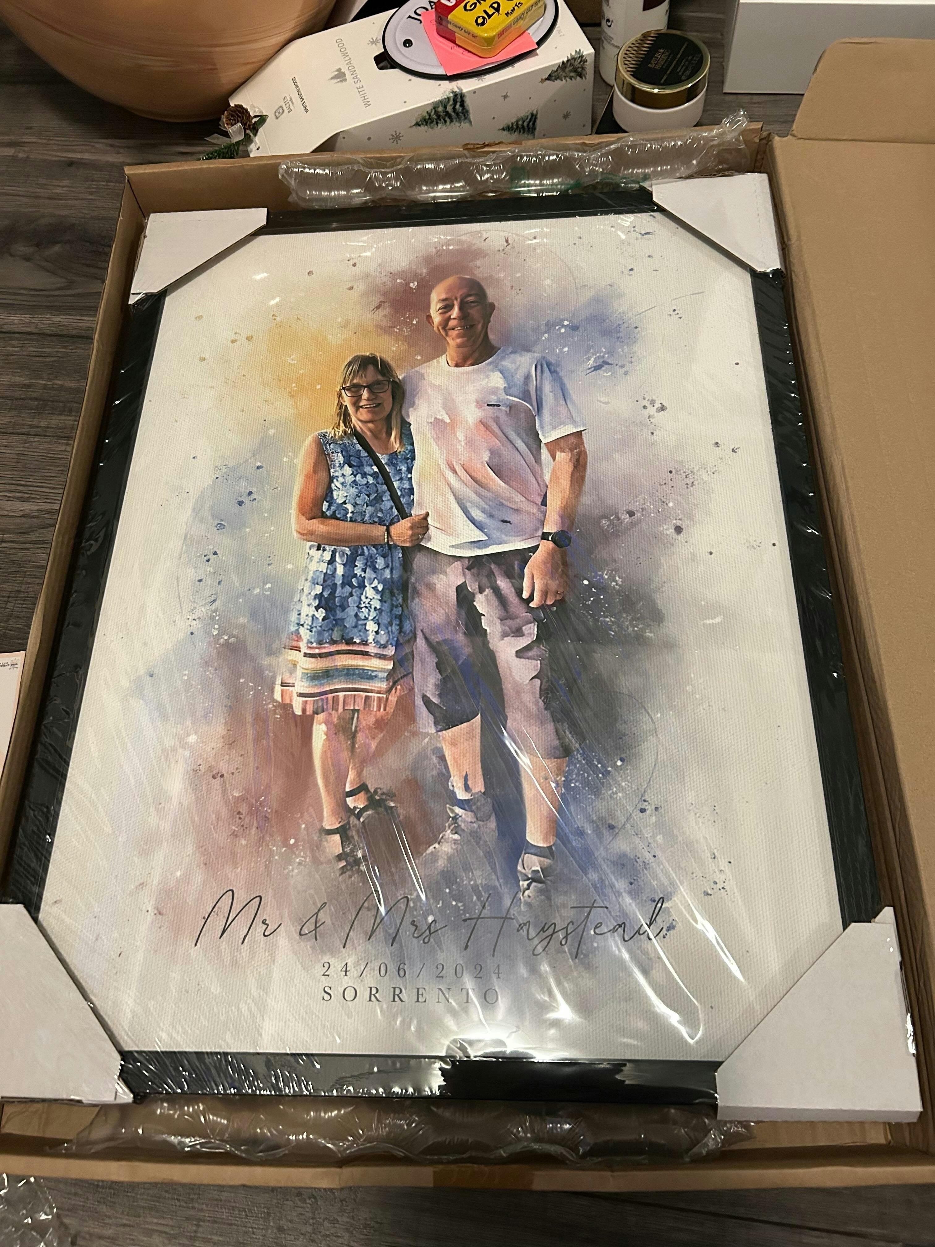 Laura restored a damaged black and white photo of my parents. I made several alterations, each taking 2days, which were done to my requests without a problem. The print is digitally converted to a watercolour effect, not an actual painting. I understood this, and would not have expected a hand painted watercolour for this price! Laura skillfully adds her touches to alter the image as requested. The result is a lovely rendition of a battered photograph and will make a perfect gift for my Mother. Very good value in my opinion. Problem with Evri delivery was sorted promptly, thank you.